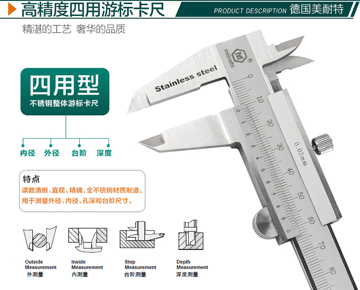 德国美耐特正品不锈钢游标卡尺高度深度内外径尺测量工具150mm...